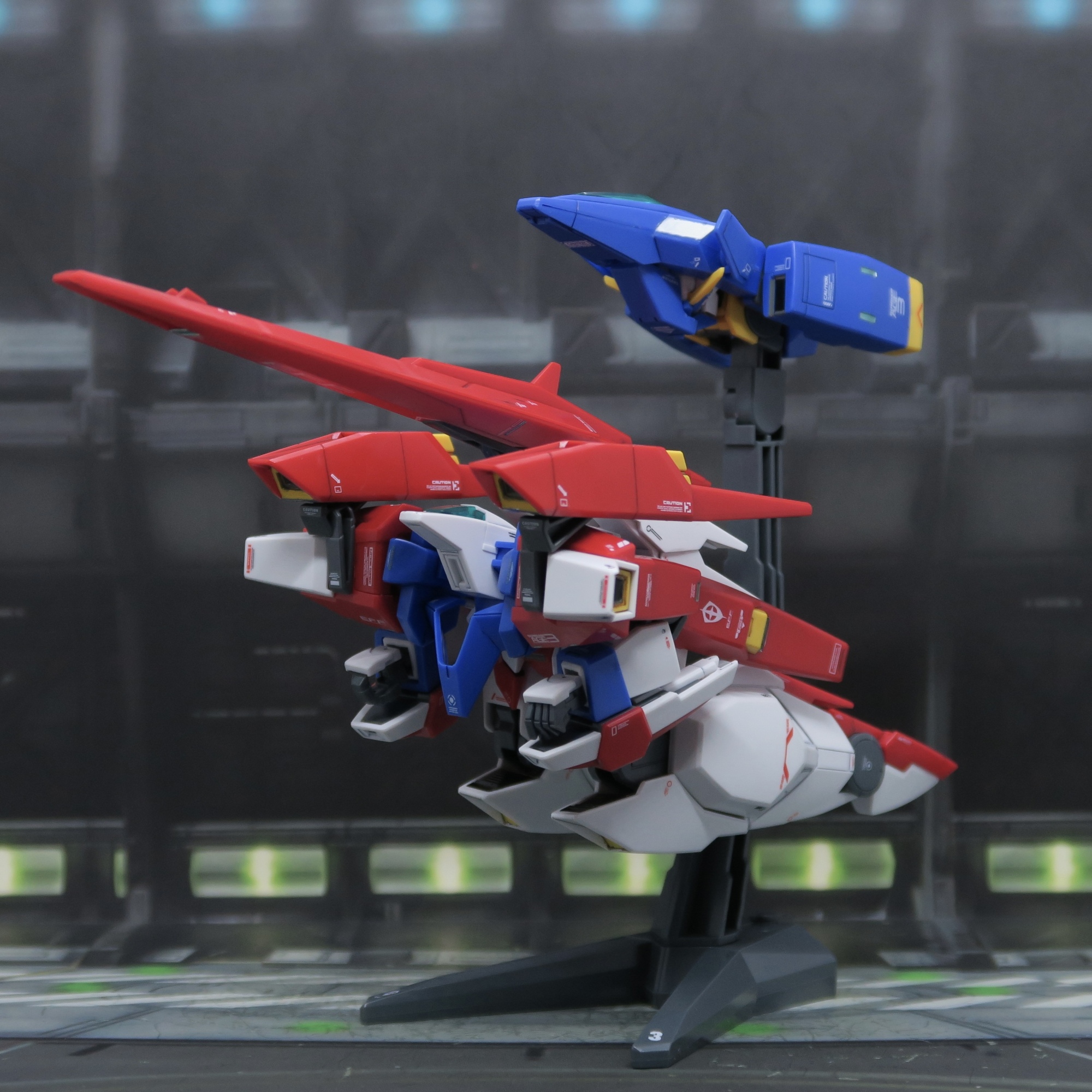 完美還原 ZZ高達嘅分離式變型…第一話ZZ高達確實係咁樣兩件分體合體變形,所以,我哩個Z高達迷,唔承認ZZ高達係Z高達嘅延續。支架有相當嘅加分,可以程現分離變形兩機共同展示,亦可以收起可替換手,哩種支架唔係度身訂造,但處處洽用。