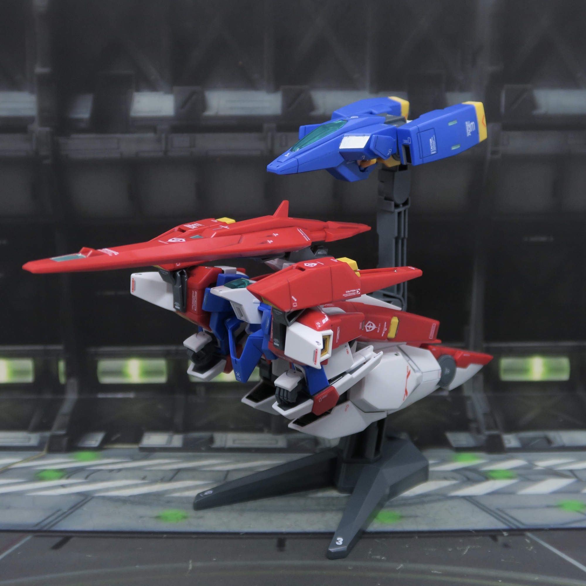 完美還原 ZZ高達嘅分離式變型…第一話ZZ高達確實係咁樣兩件分體合體變形,所以,我哩個Z高達迷,唔承認ZZ高達係Z高達嘅延續。支架有相當嘅加分,可以程現分離變形兩機共同展示,亦可以收起可替換手,哩種支架唔係度身訂造,但處處洽用。