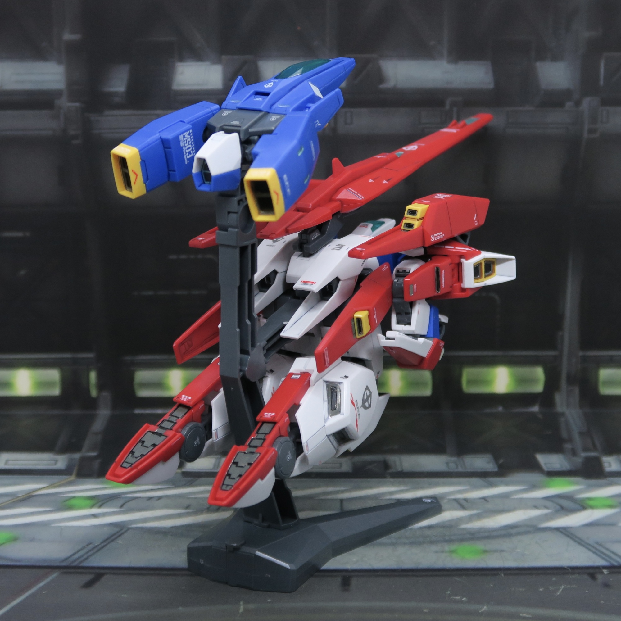 完美還原 ZZ高達嘅分離式變型…第一話ZZ高達確實係咁樣兩件分體合體變形,所以,我哩個Z高達迷,唔承認ZZ高達係Z高達嘅延續。支架有相當嘅加分,可以程現分離變形兩機共同展示,亦可以收起可替換手,哩種支架唔係度身訂造,但處處洽用。