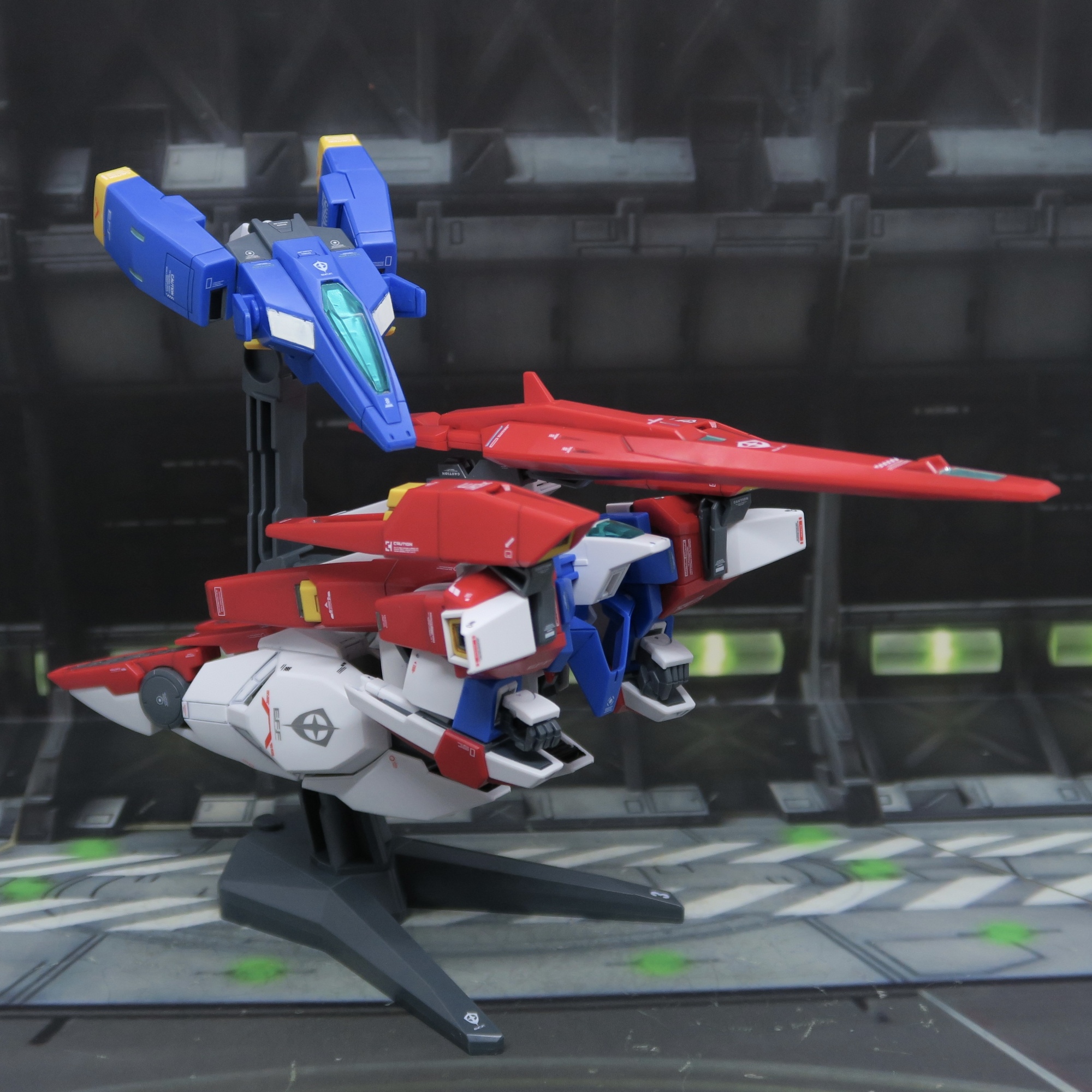 完美還原 ZZ高達嘅分離式變型…第一話ZZ高達確實係咁樣兩件分體合體變形,所以,我哩個Z高達迷,唔承認ZZ高達係Z高達嘅延續。支架有相當嘅加分,可以程現分離變形兩機共同展示,亦可以收起可替換手,哩種支架唔係度身訂造,但處處洽用。