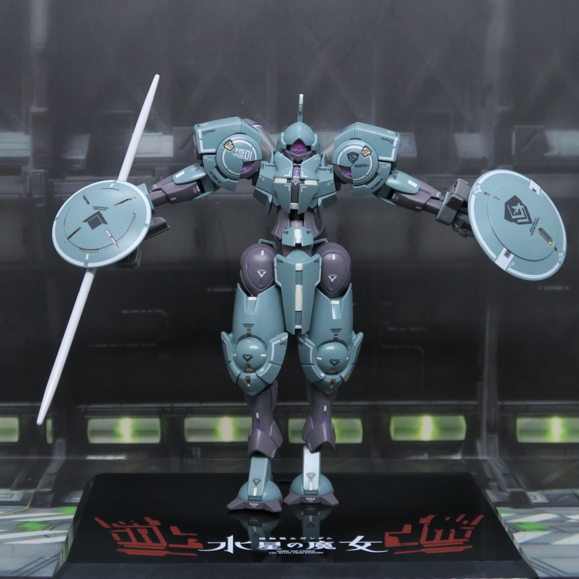 今次《水星之魔女》入面,敵機再唔係公式化嘅「量產型綠色,ACE 或者隊長係藍色」,而「有角的」亦唔係隊長機嘅特色,「角」(天線)已變成另一種作用嘅比賽勝利條件,所以……「有角的」都唔代表係咩。雖然細節係有,但係…補色起上嚟,又係另一回事。特別係噴咀位置,補色了,唔用水貼亦一樣有其特色。全身嘅裂甲設定,有「獨角獸」DNA,增加外露機械感嘅可觀性,亦可以減少需要做無縫嘅需要,一舉兩得。雙盾嘅設定亦得我歡心,左邊要盾,難道右邊不會受襲嗎?