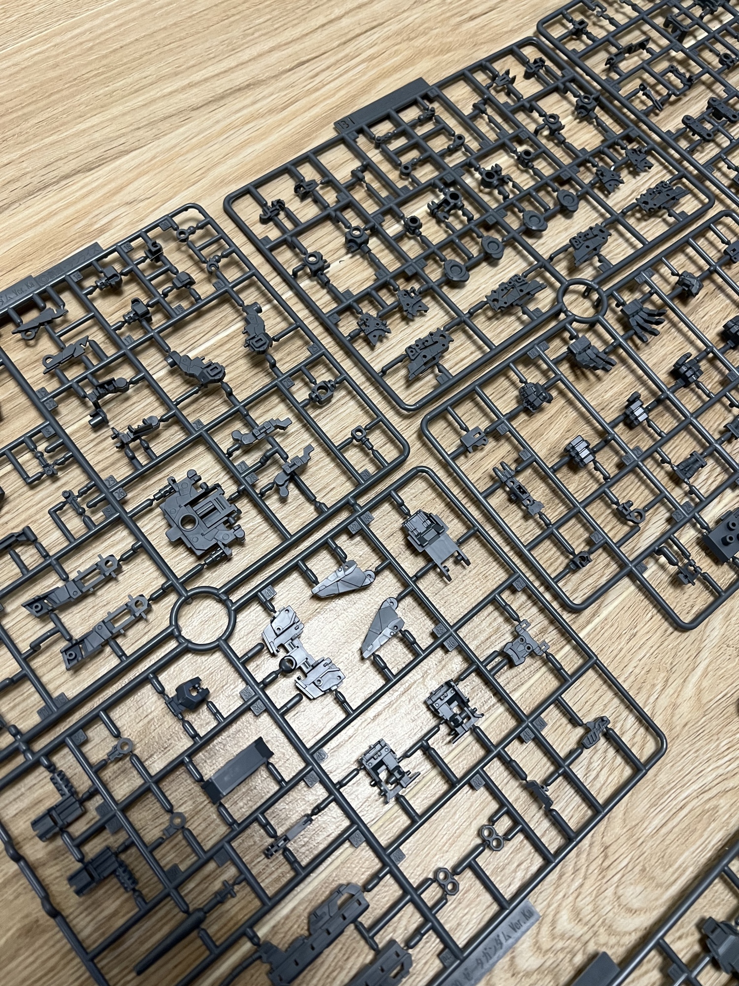 板件數量唔算多,但量唔少,A-E板件每板都四五十粒零件,砌條骨架都用咗唔少時間。當中見到腳部份嘅骨架非常仔細,相比2.0版同RG版嘅腳部,絕對係Ka氏嘅技術展現。最完整嘅腳部骨架,而且非常多變型結構,相信骨架係本作最大賣點。只可惜嘅係,骨架方面近年Ver. Ka 嘅都放棄為上身及手部提供完整骨架,部份連接就直接用上外甲,有種1.0嘅感覺。雖然如此,手部手踭都出現除咗直向嘅屈曲,另外橫向嘅移動,看似解決一直槍管後部,夾喺手臂同腰間嘅不自然手型姿態,試睇睇完成品如何。MG Ver. Ka 近年都唔再為頭部玩燈,所以直接分好晒眼部嘅透明分年,唔再需要貼貼紙都分辨眼同眼框,1/144 都做到嘅,無理由1/100 唔做。變型結構無論係1.0定2.0 (RG咁細嘅就無法) 都一直用好細嘅暗扣位去扣住啲手手腳腳,今次終改良,變成大扣位或者整粒分件嘅插槽扣位,終於唔駛變型完就成隻嘢有關節炎咁。