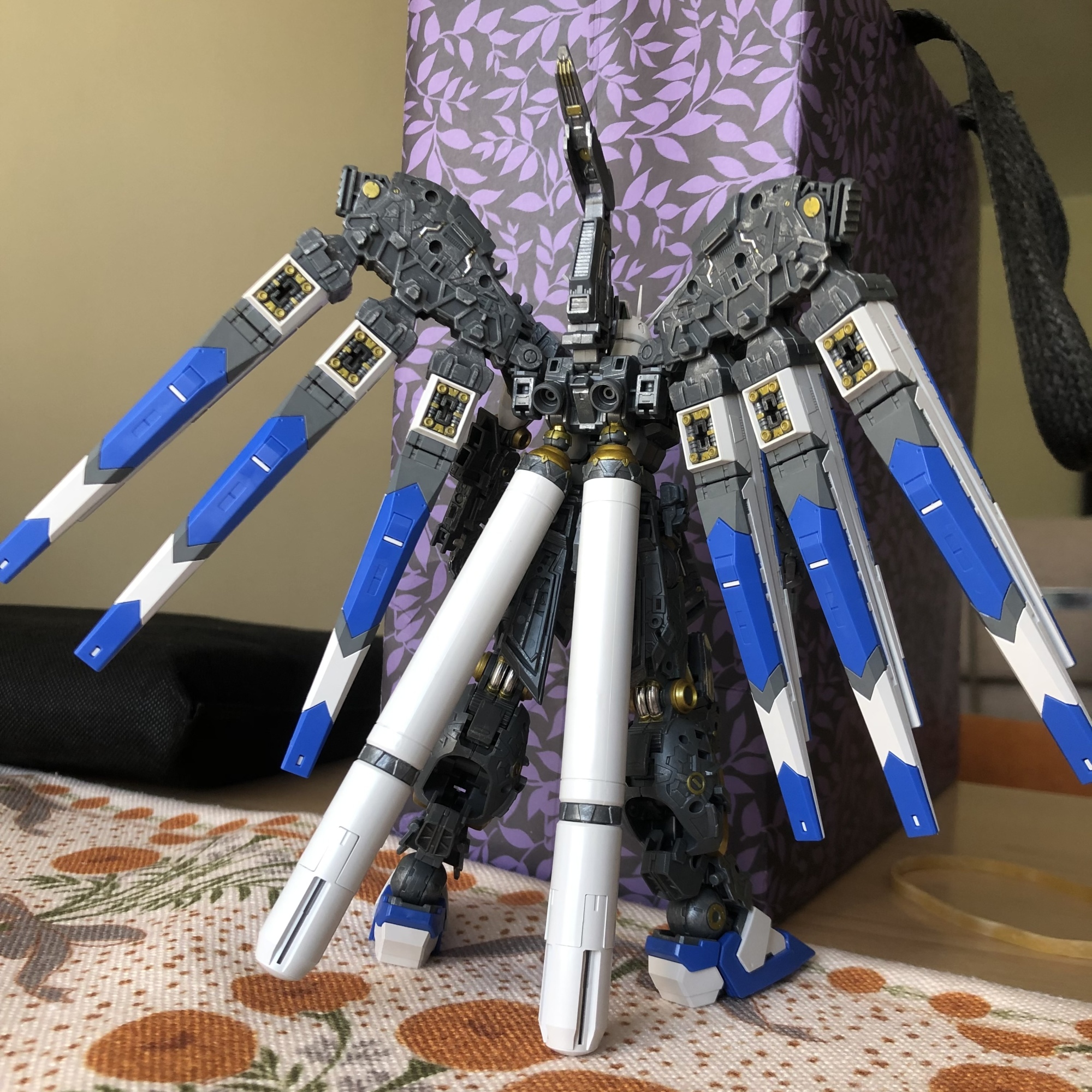 其實佢係高達第一代「平衡宇宙」嘅代表,其實叫Hi Nu,機體番號係:RX-93-2,都係阿寶最後座駕,Nu 係動畫版嘅最後座駕,而Hi Nu 就係小說同後期漫畫嘅最後座駕。而配色方面就改為鮮明少少嘅藍配白,不過奇怪在⋯⋯不同情況下,會有紫配白,而且同G3一樣,每個版本嘅配色都唔一致,藍白配又有分別,紫白配亦有分別,究竟,官方嘅配色係方一個作先作準?既然都有就純以藍白灰配色,水貼亦用哩個色tone嚟統一一下,減少原設定中,紅色帶嚟嘅一點點不協調。